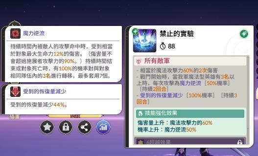 她的關鍵核心技能——「禁止的實驗」,能讓全隊(只要是魔法類角色)觸發「魔力逆流」效果。