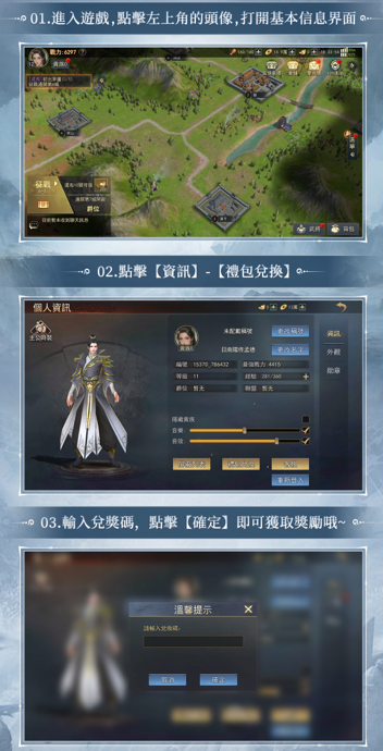 ②點選【資訊】-【禮包兌換】-輸入【兌獎碼】-點擊【確定】即可