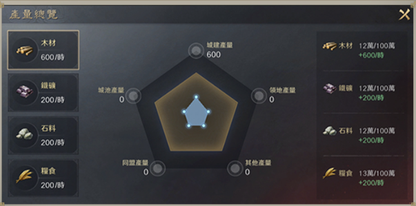 - 城內資源升級後每小時產量提高,是最不會背叛你的經濟來源。