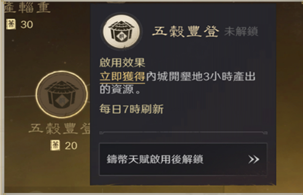 - 這技能能一次把你城內幾小時的資源一次領到手。