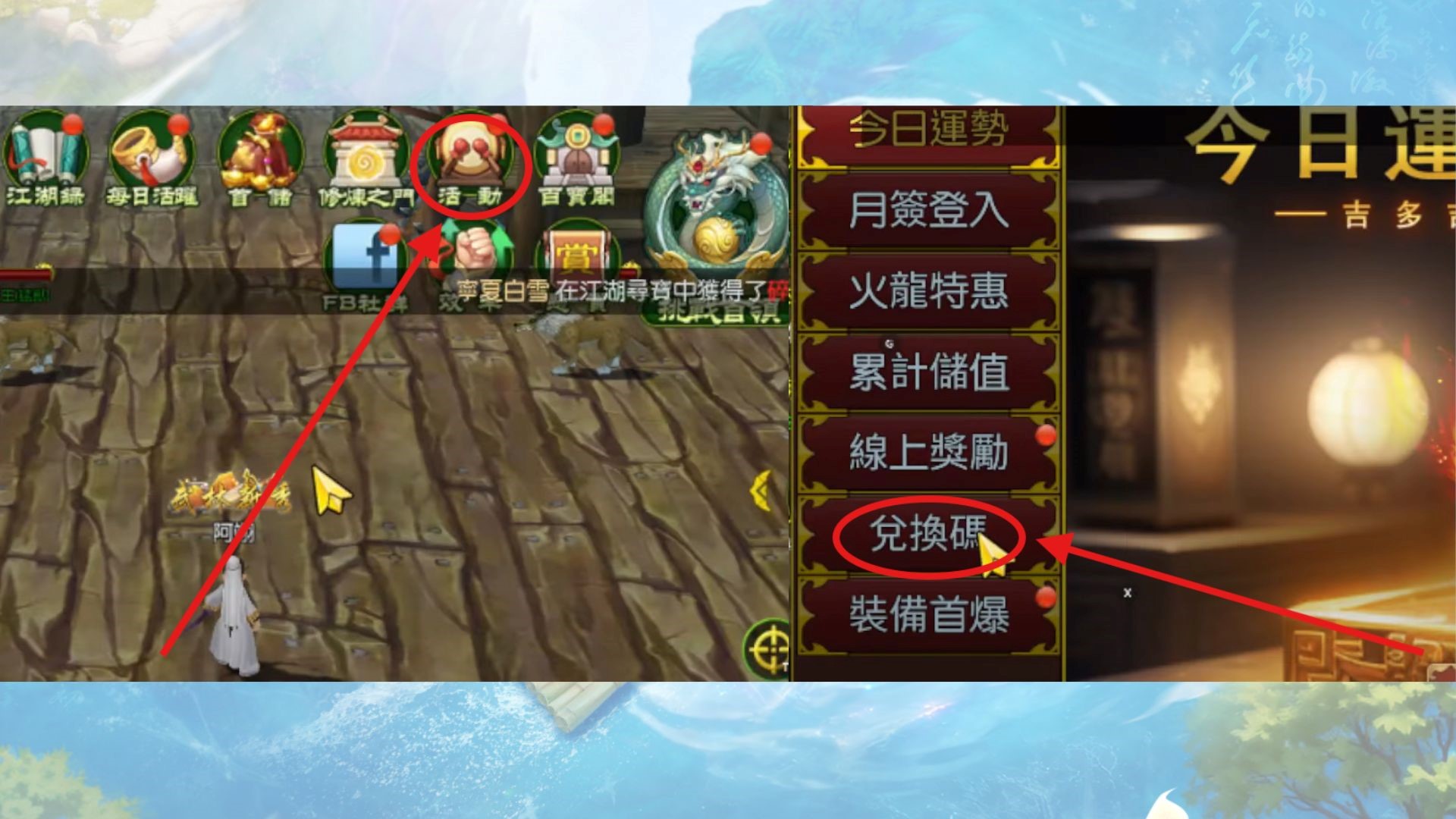2️點選「活動」菜單,尋找「兌換碼」區。